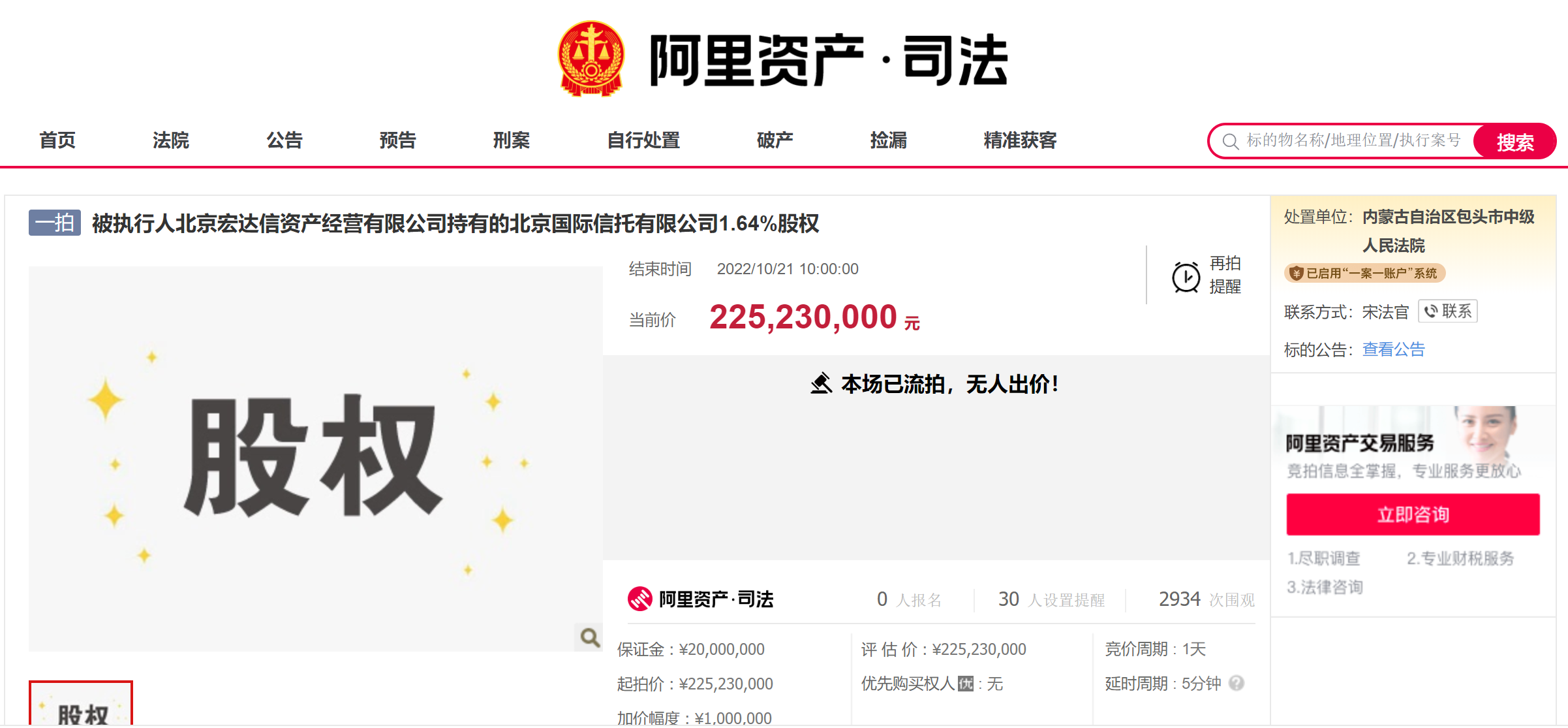 10月21日,阿里司法拍賣網(wǎng)上結(jié)束了一場股權(quán)拍賣,標(biāo)的為被執(zhí)行人北京宏達(dá)信資產(chǎn)經(jīng)營有限公司(以下簡稱“北京宏達(dá)信資產(chǎn)”)持有的北京國際信托有限公司(以下簡稱“北京信托”)1.64%股權(quán),起拍價(jià)2.2523億元,最終因無人出價(jià)而流拍。