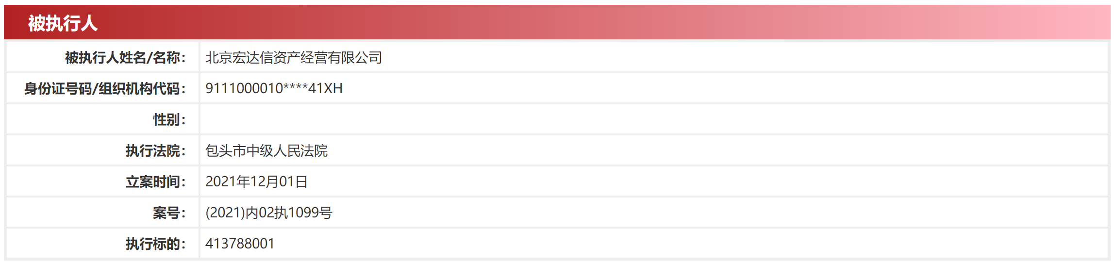 中國執(zhí)行信息公開網(wǎng)顯示,包頭市中級(jí)人民法院于去年12月立案,北京宏達(dá)信資產(chǎn)作為被執(zhí)行人,執(zhí)行標(biāo)的金額為4.14億元。