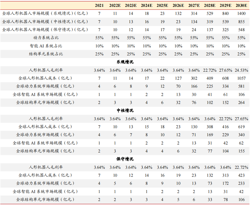 ▲中性情況下預(yù)計(jì) 2030 年全球人形機(jī)器人三大系統(tǒng)市場(chǎng)規(guī)模分別可達(dá) 340/62/155 億元