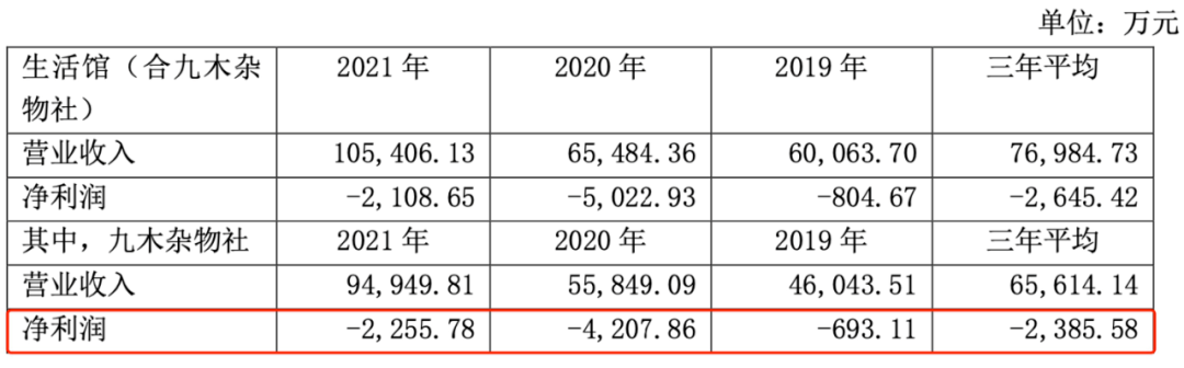 除此之外,2019-2021這三年間,九木雜物社一直在虧,凈虧損分別為693.11萬元、4207.86萬元、以及2255.78萬元。三年平均虧損超2300萬元。