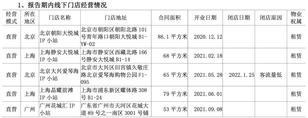 上半年,IP小站在營線下門店4家,共實現(xiàn)營業(yè)收入149.31萬元。(2021年上半年6家店貢獻252.7萬元收入)。經(jīng)計算,單店收益下降(北京大興愛琴海IP小站門店于2022年1月25日關(guān)店不作為報告期統(tǒng)計)。