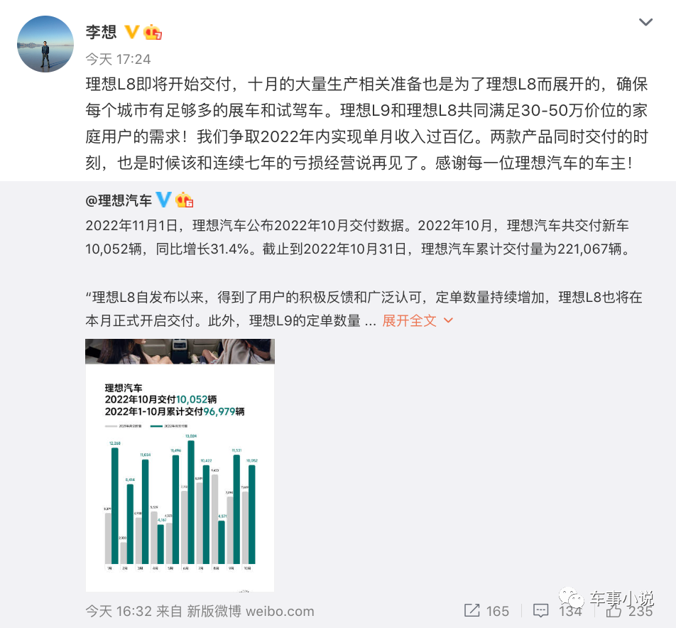 對(duì)此,李想11月1日自己在社交平臺(tái)稱,十月的大量生產(chǎn)相關(guān)準(zhǔn)備是為了理想L8而展開的。據(jù)其表示:”爭(zhēng)取2022年內(nèi)實(shí)現(xiàn)單月收入過百億。兩款產(chǎn)品同時(shí)交付的時(shí)刻,也是時(shí)候該和連續(xù)七年的虧損經(jīng)營(yíng)說再見了”。