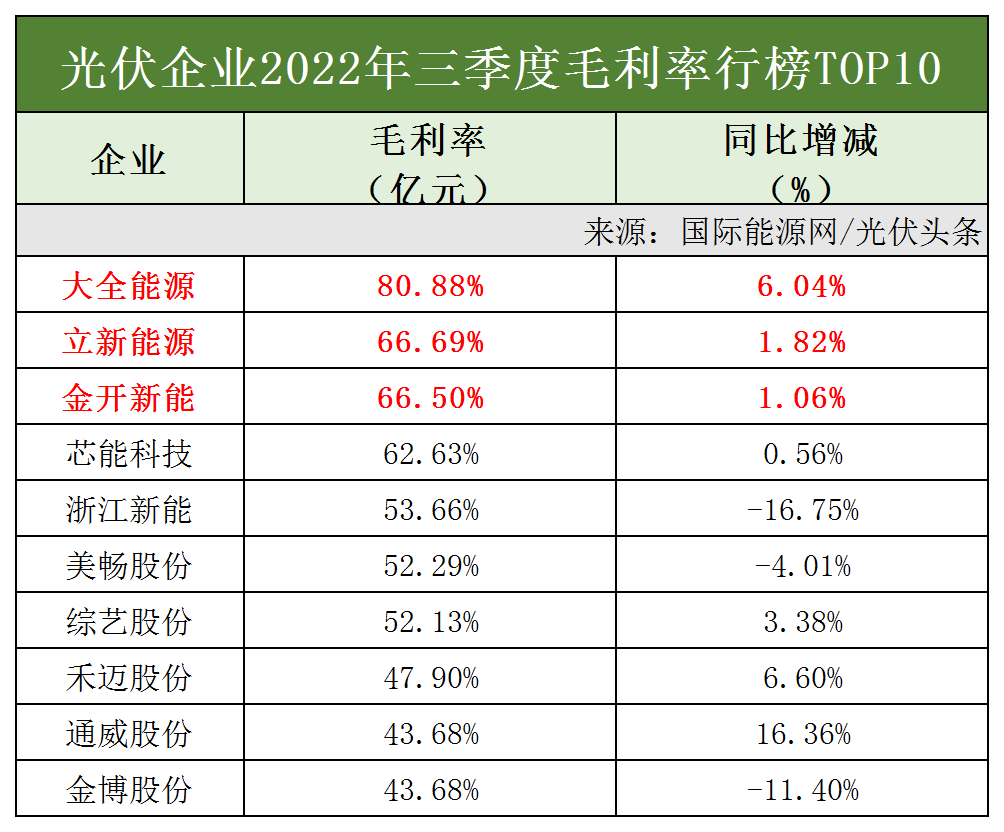 毛利率方面,大全能源以80.88%排名第一, 立新能源以66.69%排名第二, 金開新能排名第三,毛利率為66.50%。毛利率排名前十的企業(yè)中,電站企業(yè)有5家,硅料企業(yè)兩家,輔材企業(yè)兩家,逆變器企業(yè)一家。