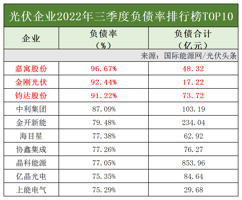 負(fù)債率方面,嘉寓股份以96.67%排名第一,金剛光伏排名第二,負(fù)債率為92.44%,鈞達(dá)股份排名第三,負(fù)債率91.22%。