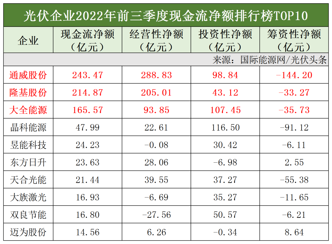 三季度總的現(xiàn)金流凈額方面,92家企業(yè)合計(jì)844.67億元,通威股份、隆基股份、大全能源排名前三,合計(jì)623.91億元,占比為73.86%??梢娂幢闶乾F(xiàn)金流方面,頭部企業(yè)優(yōu)勢(shì)也十分明顯。