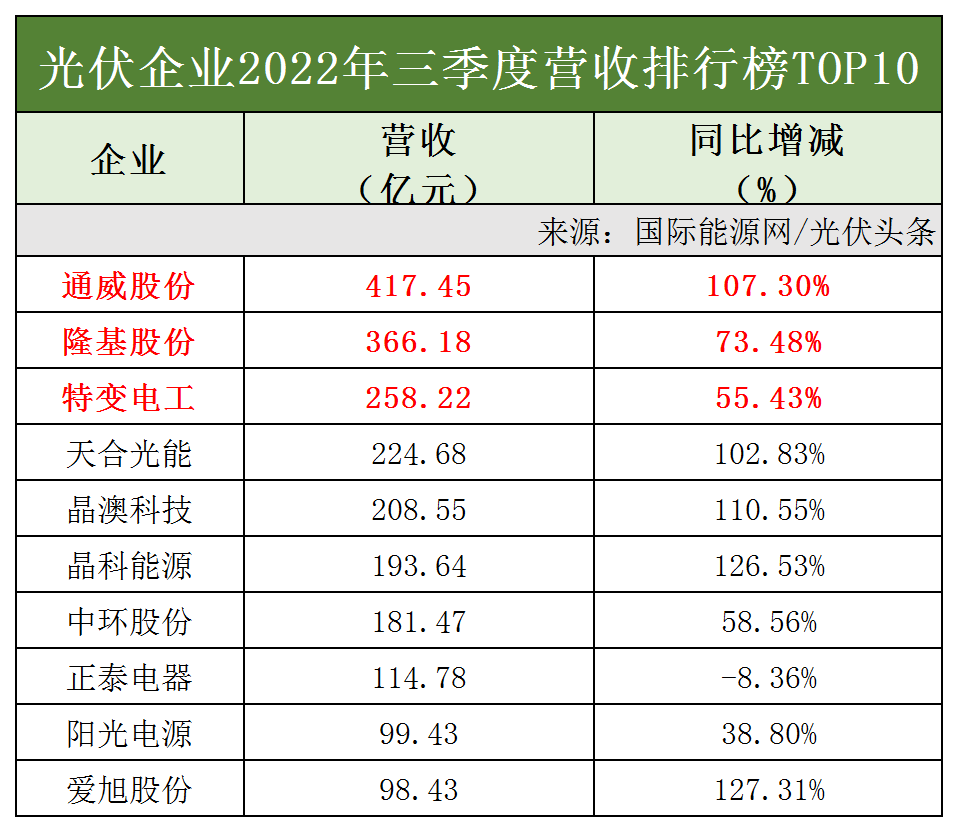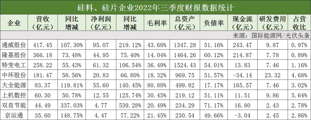 營(yíng)收方面,三季度92家企業(yè)營(yíng)收合計(jì)3524.27億元,超過百億元的企業(yè)依次為通威股份、隆基股份、特變電工、天合光能、晶澳科技、晶科能源、中環(huán)股份、正泰電器等8家企業(yè),合計(jì)營(yíng)收1964.97億元,總?cè)?2家企業(yè)總營(yíng)收的56%。