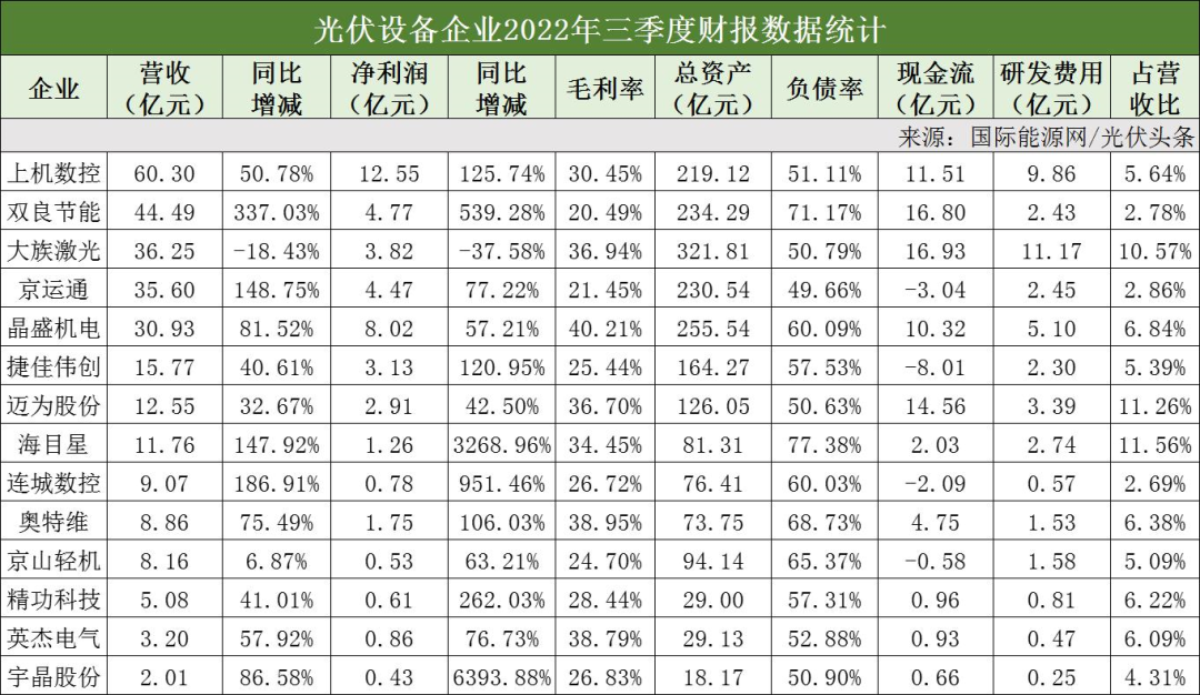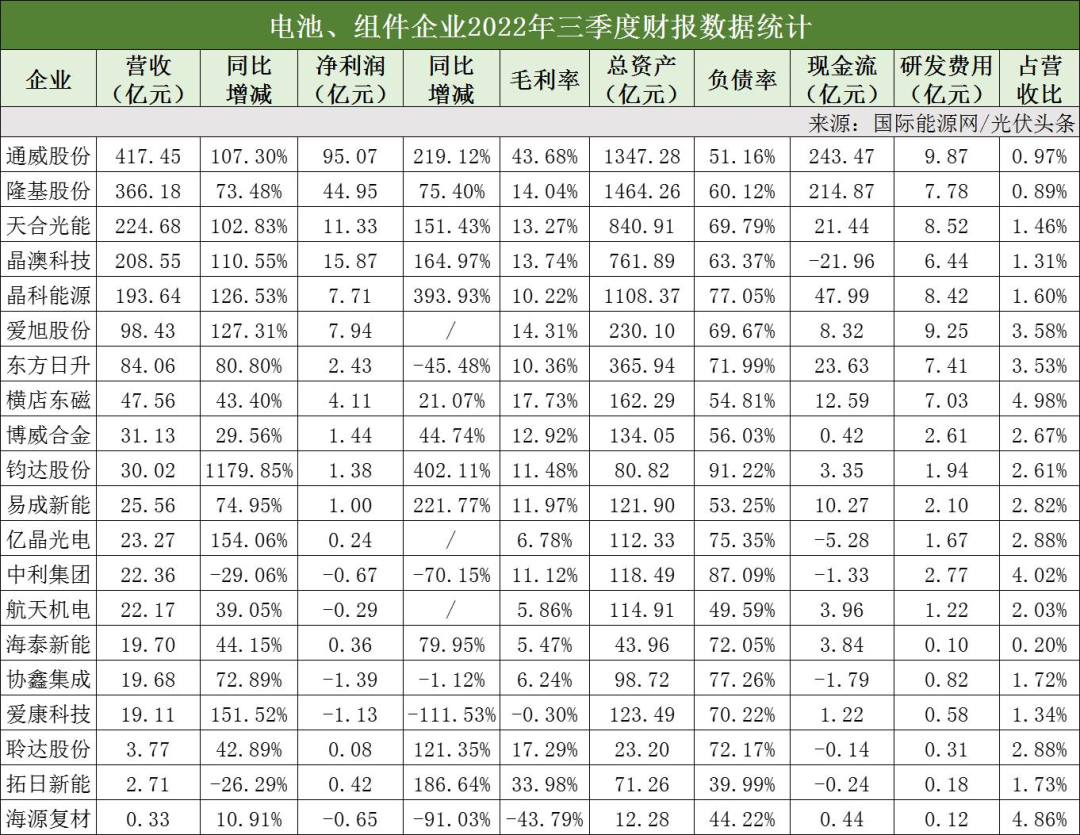國(guó)際能源網(wǎng)/光伏頭條(PV-2005)梳理了92家光伏相關(guān)上市企業(yè)財(cái)報(bào),基于營(yíng)收、凈利潤(rùn)、毛利率、負(fù)債率、現(xiàn)金流、總資產(chǎn)、研發(fā)投入等多個(gè)維度,解析光伏企業(yè)的“鈔能力”。