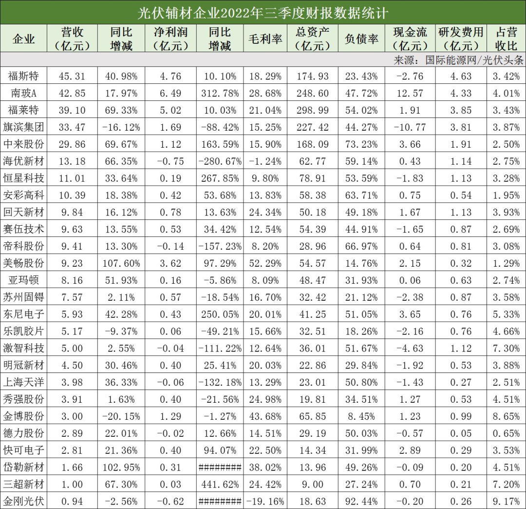 主營(yíng)光伏玻璃、背板、金剛線、膠膜、銀漿的26家光伏輔材企業(yè)中,23家企業(yè)營(yíng)收實(shí)現(xiàn)正向增長(zhǎng)。旗濱集團(tuán)、樂凱膠片、金博股份、金剛光伏營(yíng)收同比下降。