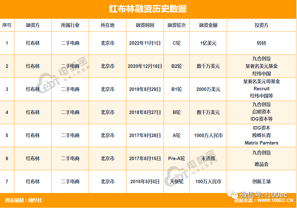 據(jù)網(wǎng)經(jīng)社“電數(shù)寶”(DATA.100EC.CN)電商大數(shù)據(jù)監(jiān)測數(shù)據(jù)顯示,截至目前,紅布林已先后獲得7輪融資,融資總金額超11億元人民幣,而本輪融資也是循環(huán)時尚行業(yè)單筆最大規(guī)模融資。紅布林前六輪融資,背后的資方包括 IDG、尚高、九合、經(jīng)緯中國、啟明創(chuàng)投、險峰等頂級知名機構(gòu),并且?guī)缀趺枯喰氯谫Y,都會獲得老股東的持續(xù)加碼。