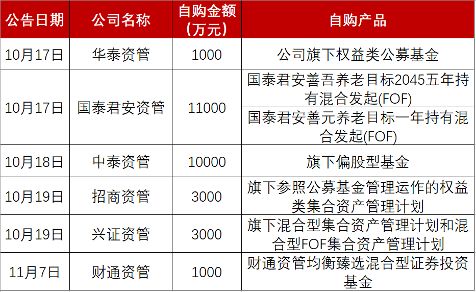 事實上,自10月中旬以來,不斷有大型公募基金宣布自購,券商資管們也都積極參與其中,累計金額2.9億元,自購的產(chǎn)品類型偏向于權(quán)益或者FOF產(chǎn)品。