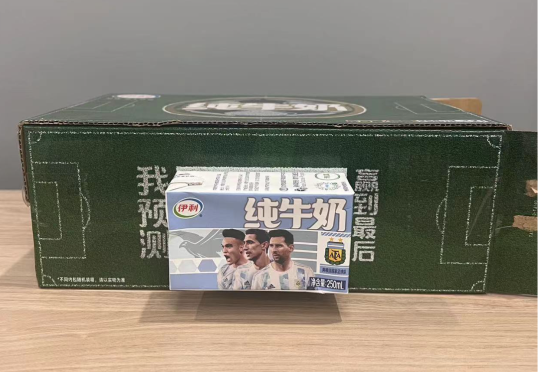 我們看到伊利在幾天前推出了一個(gè)“夢(mèng)之隊(duì)限量裝”純牛奶。名字聽上去挺普通,但它設(shè)計(jì)了一套“預(yù)測(cè)贏球”的玩法。把奶買回家之后,你可以直接把帶有阿根廷隊(duì)、西班牙隊(duì)、C羅等球隊(duì)和球星的包裝放到外箱上拍照,曬出你pick的贏家。
