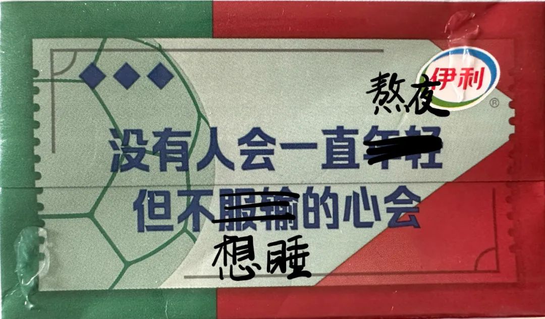 而在今年的足壇盛會(huì)開始前,伊利的限定裝仿佛在包裝設(shè)計(jì)的時(shí)候,就考慮到了社媒用戶熱愛惡搞、二創(chuàng)的屬性。因?yàn)闊o論是正面人像還是背面標(biāo)語,粉絲在當(dāng)中都有很大的魔改空間。