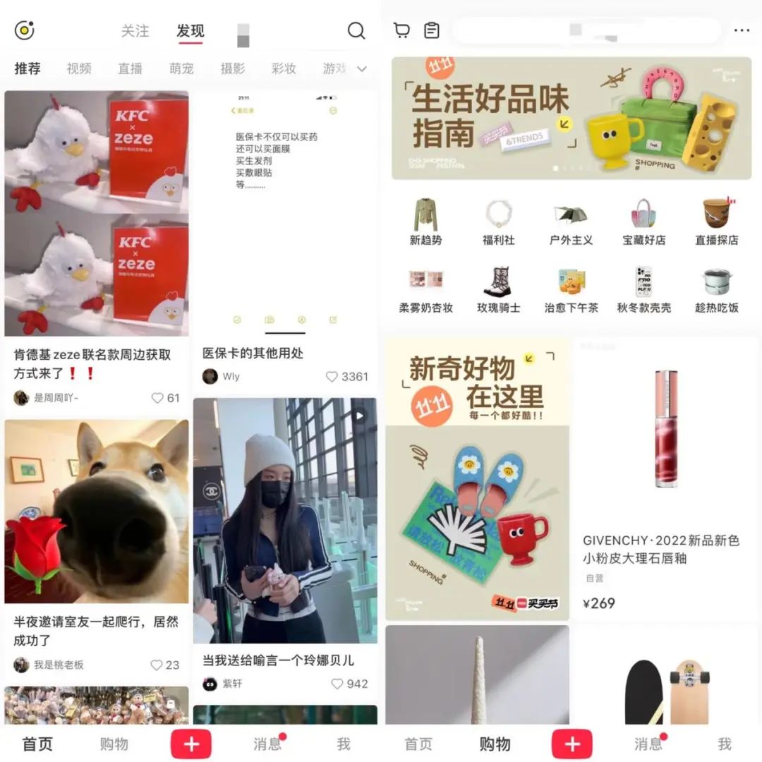 除了一些App開屏廣告之外,小紅書雙十一大促相關(guān)內(nèi)容都集中在“購物”頻道,在默認(rèn)進(jìn)入的“首頁”頻道中蹤跡寥寥,用戶很難在“首頁”頻道感知到小紅書雙十一的大促氣息。