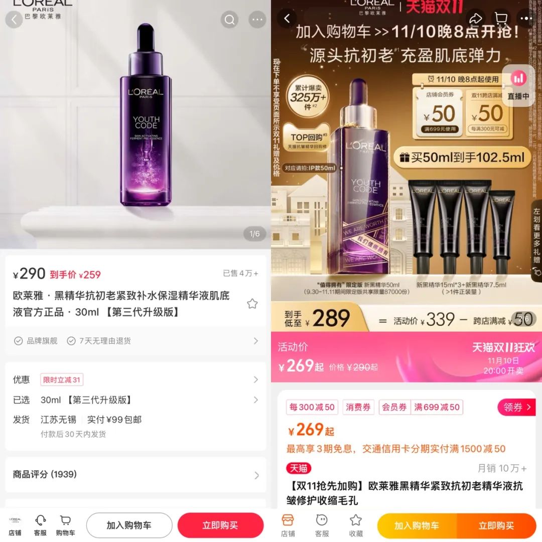 部分以官方旗艦店形式入駐小紅書的品牌如歐萊雅,在價(jià)格上并沒有顯著優(yōu)勢。以某款歐萊雅精華液為例,在不包含贈(zèng)品的情況下,小紅書每毫升活動(dòng)價(jià)高于天貓2.85元。