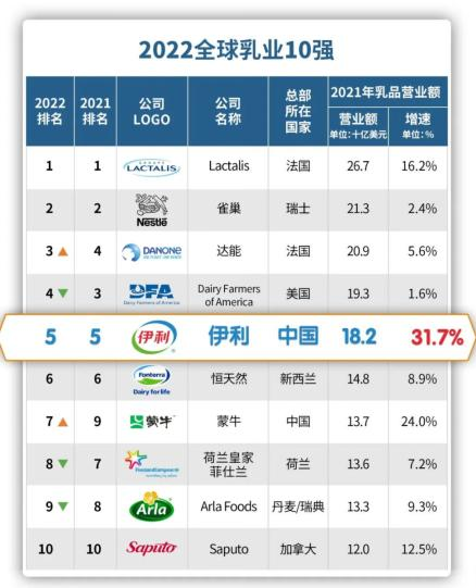 此外,伊利2021年以31.7%的增速位居20強(qiáng)榜首,進(jìn)一步縮小與達(dá)能、雀巢等公司的差距,向公司中長(zhǎng)期目標(biāo)“2025年挺進(jìn)全球乳業(yè)前3,2030年成為全球乳業(yè)第一”前行。
