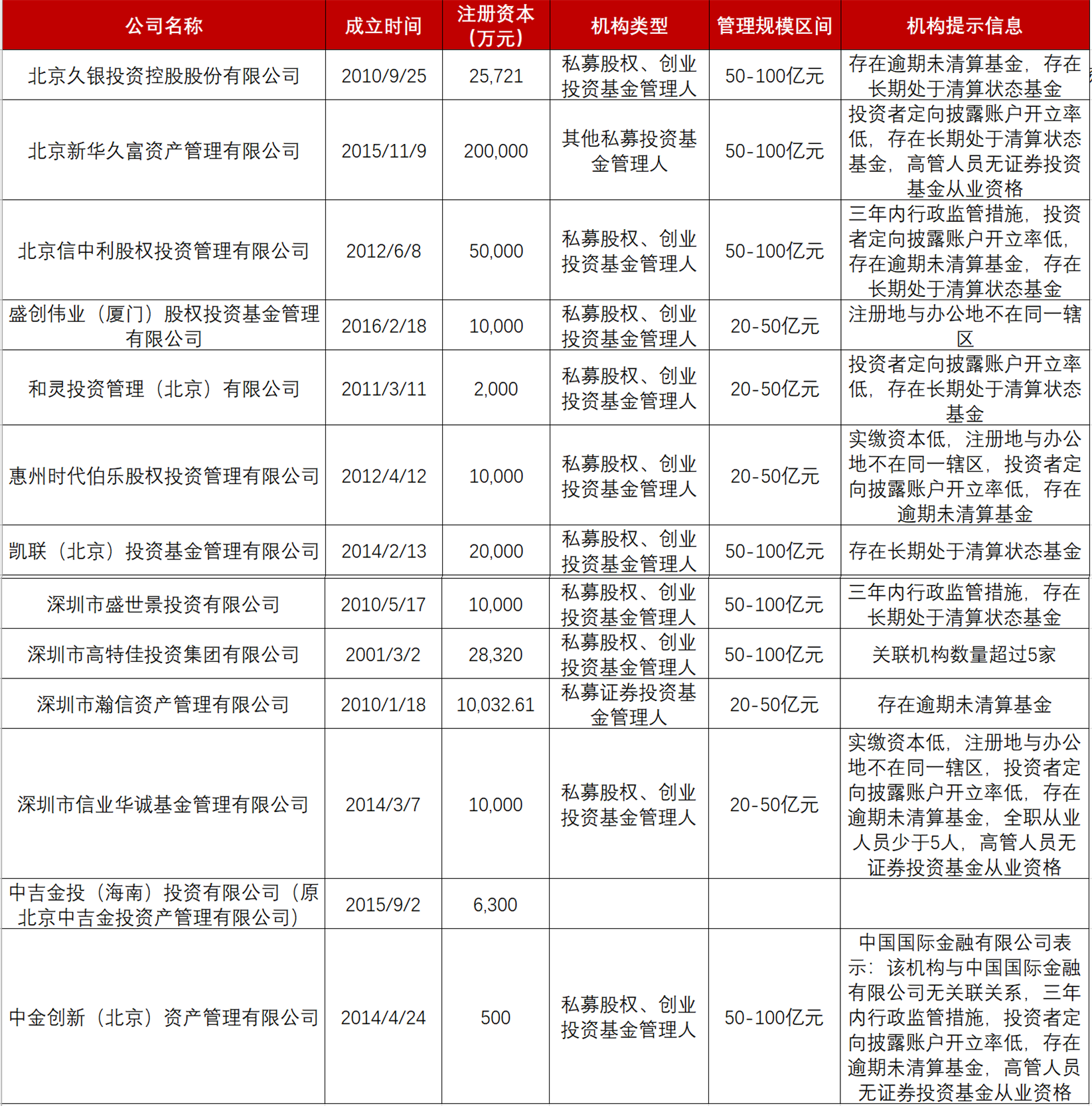 從提示信息來(lái)看,久銀控股、新華久富、信中利股權(quán)投資、和靈投資等均存在逾期未清算基金或長(zhǎng)期處于清算狀態(tài)基金,新華久富、深圳信業(yè)華誠(chéng)、中金創(chuàng)新(北京)的高管人員無(wú)證券投資基金從業(yè)資格,時(shí)代伯樂(lè)和深圳信業(yè)華誠(chéng)注冊(cè)資本實(shí)繳比例分別低至10%和0.5%。