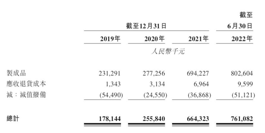 而這其中,退貨成本還只占小頭,更多是還未售出的庫(kù)存積壓。招股書(shū)顯示,僅2022年上半年制成品存貨就有超過(guò)8億元,是2019年全年的3.47倍。