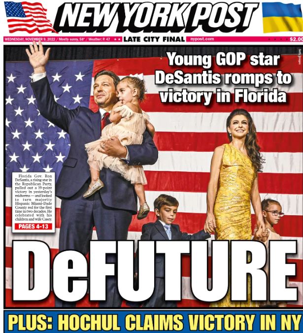 ??怂剐侣劥饲鞍l(fā)表了名為“德桑蒂斯是共和黨新領袖”的評論文,《紐約郵報》頭版直接把德桑蒂斯(DeSantis)稱為“未來”(DeFuture)。