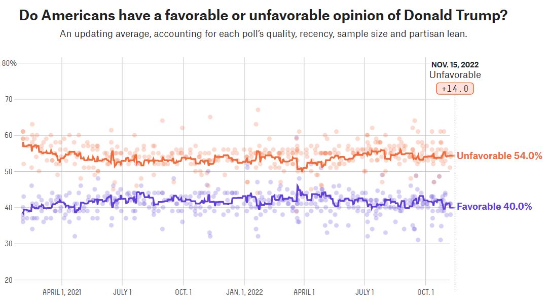 Five Thirty Eight截至15日的綜合民調顯示,特朗普的支持率依然維持在40%,與他任美國總統(tǒng)時處于同一水平,沒有出現(xiàn)大幅波動。