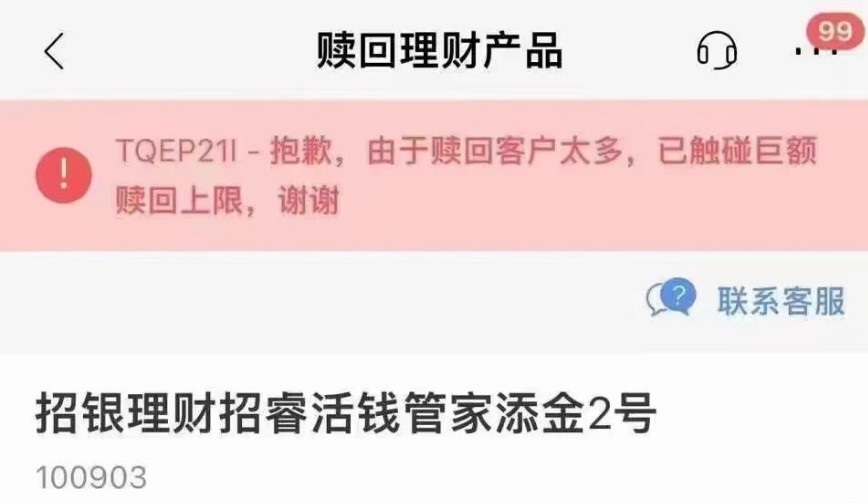 涉及產(chǎn)品包括招銀理財發(fā)行的一款R2中低風險產(chǎn)品——招銀理財招睿活錢管家添金2號。11月17日,該產(chǎn)品已可正常贖回。招商銀行理財經(jīng)理向媒體解釋稱,發(fā)生大額贖回是由于贖回該產(chǎn)品的客戶太多,達到了系統(tǒng)限制的比例。