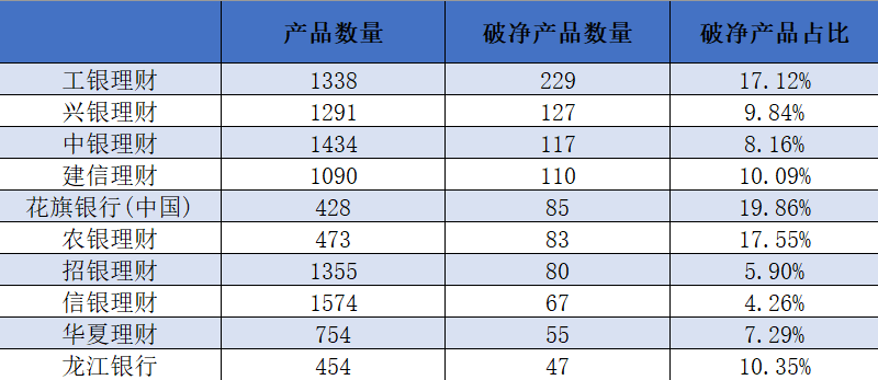 統(tǒng)計單位凈值小于1的破凈產(chǎn)品及其公司后,共有150家管理公司有破凈產(chǎn)品,破凈產(chǎn)品數(shù)量排名前五的管理公司包括工銀理財、興銀理財、中銀理財、建信理財和花旗銀行(中國)。