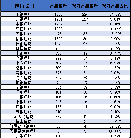其中,有1176只破凈產(chǎn)品來自26家理財子公司,占所有破凈產(chǎn)品的63.94%。