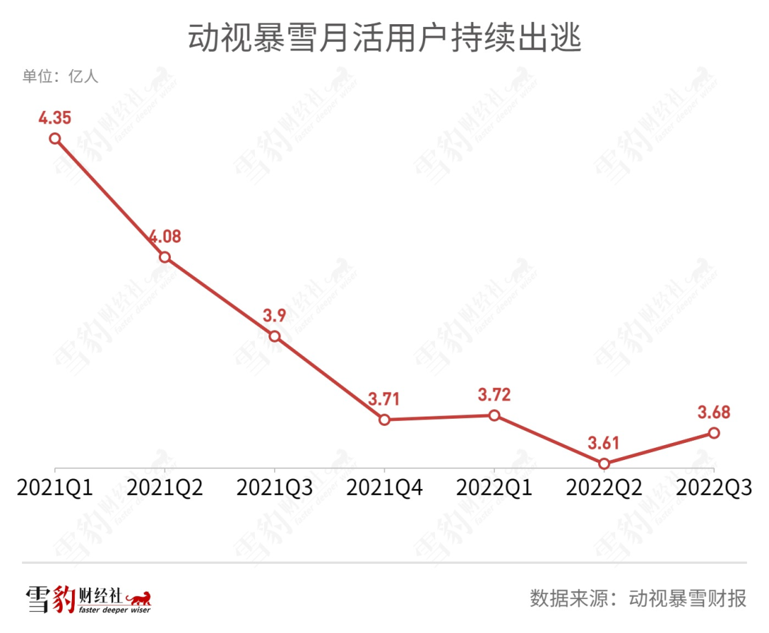 動視暴雪急切提價背后,是業(yè)績不佳的壓力。2022年Q3,暴雪營收同比下降13.9%至17.8億美元,凈利潤同比下降31.9%至4.35億美元。同一時期,暴雪MAU(月活用戶數(shù))同比下降5.6%至3.68億,較去年最高點已丟失了近7000萬玩家。