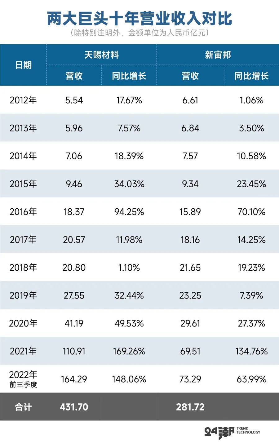 另據(jù)24潮統(tǒng)計,在2012年~2022年前三季度期間天賜材料營收合計為431.7億元,是后者的1.53倍。