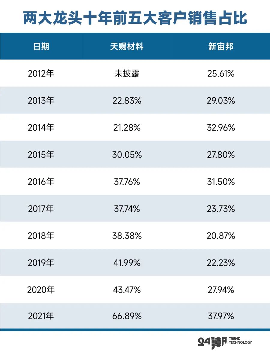 如下表所示,過去9年間,天賜材料對前五大客戶的銷售占比已經由2013年的22.83%增至2021年的66.89%;反觀新宙邦,過去十年間其對前五大客戶的銷售占比從未超過40%。