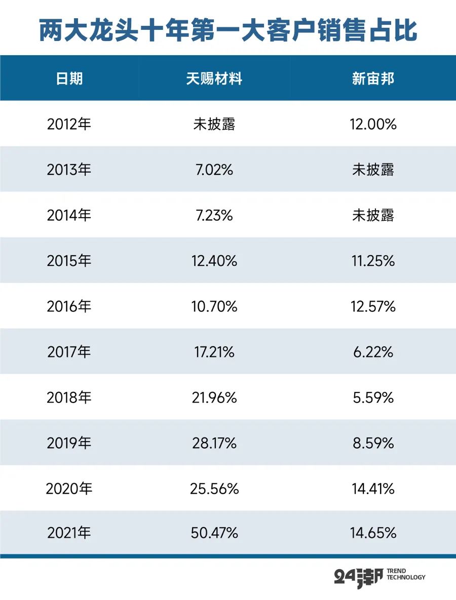 從對第一客戶的銷售數(shù)據(jù)變化看,天賜材料對大客戶依賴的風險還在加速聚集。如下表所示,天賜材料對第一大客戶的銷售占比已經連續(xù)5年保持增長趨勢,銷售占比已經從2013年的7.02%激增至2021年的50.47%,而新宙邦2021年對第一客戶的銷售占比僅為14.65%。