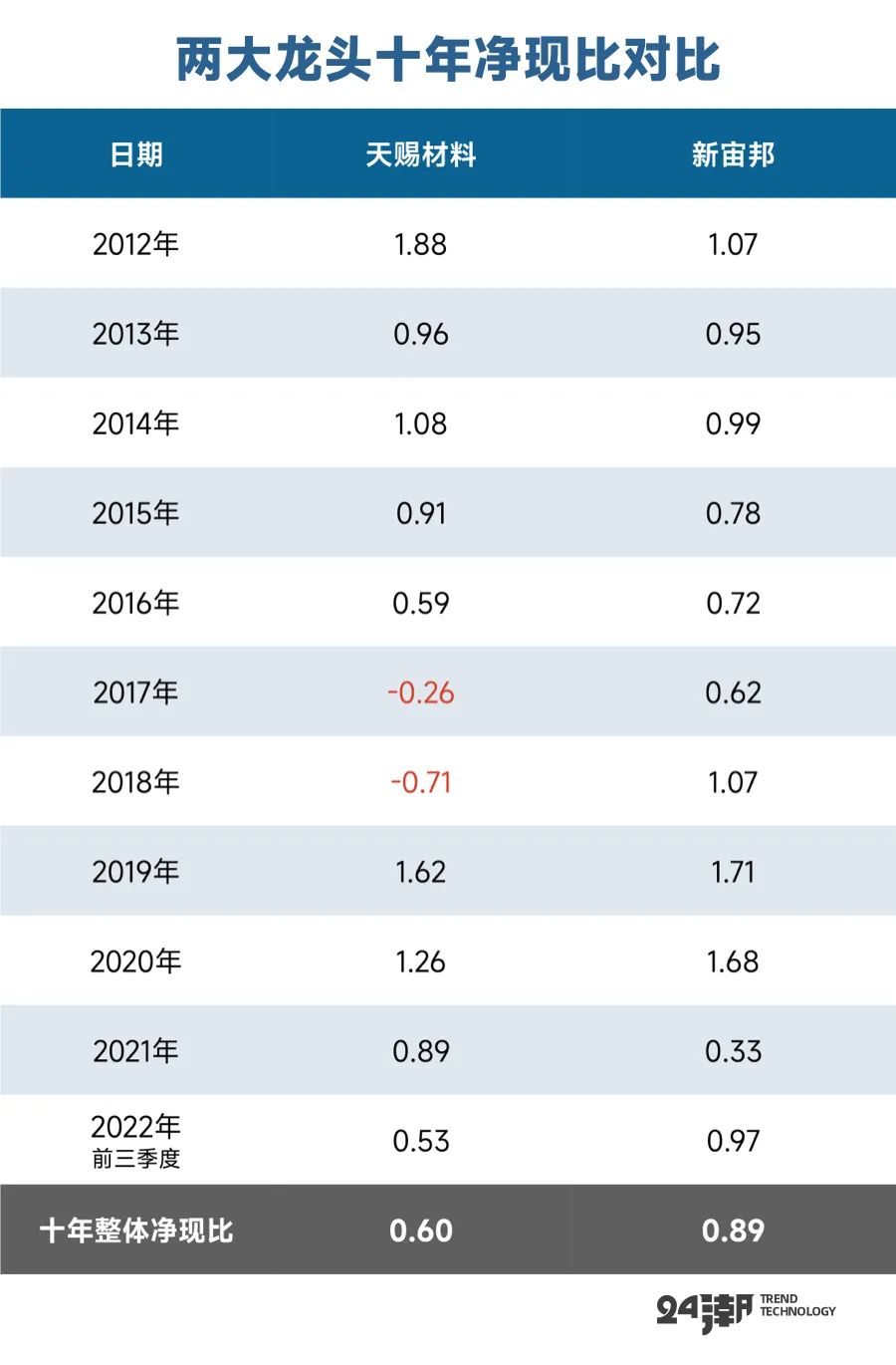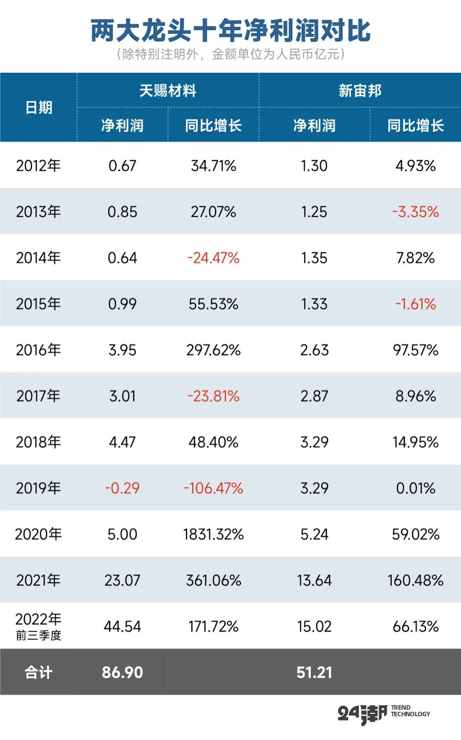 在2012年-2022年9月期間,天賜材料合計創(chuàng)造凈利潤86.9億元,是新宙邦的1.70倍。