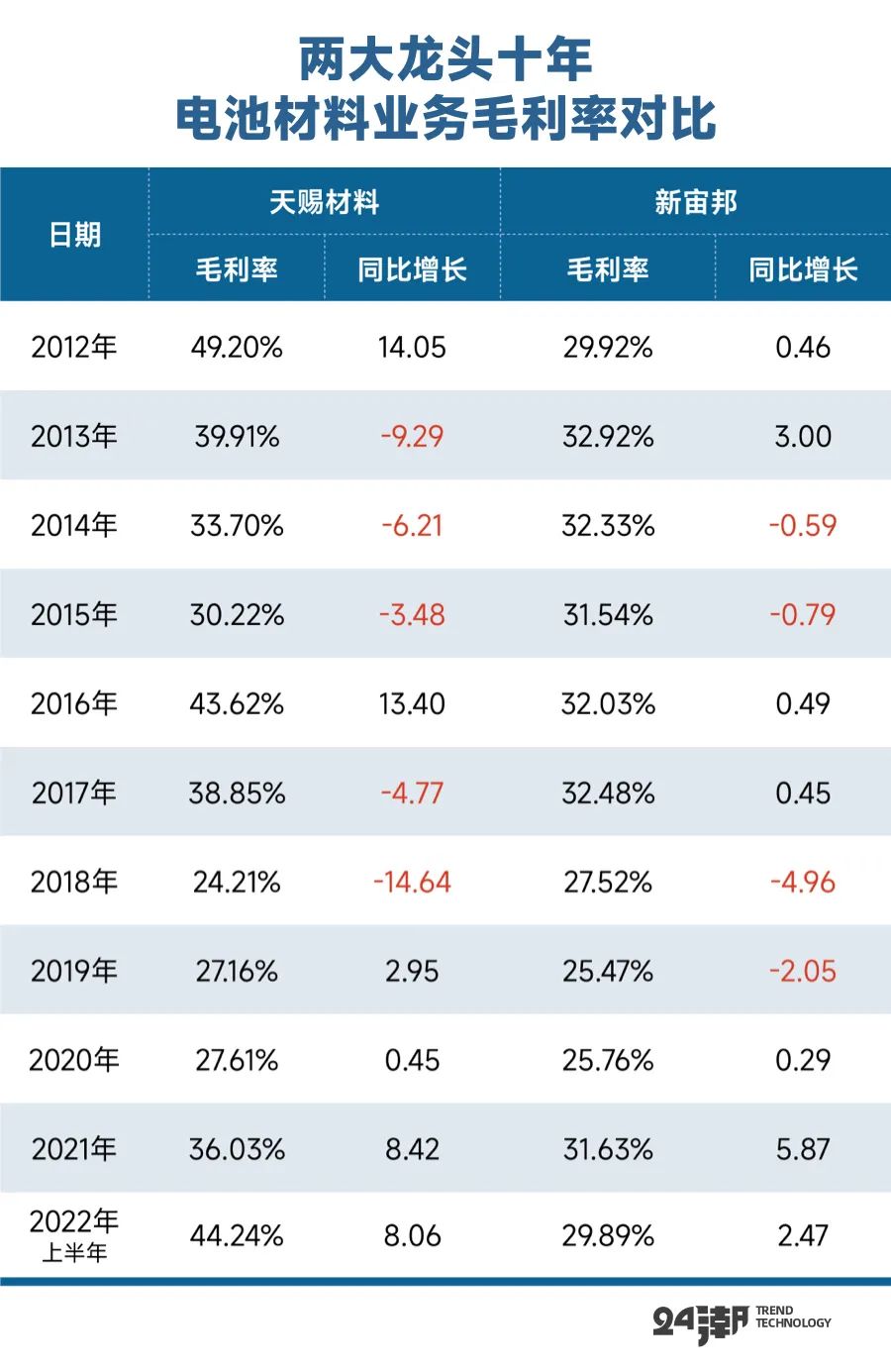 據(jù)24潮統(tǒng)計,在過去近11年間(2012年-2021年及2022年前三季度),天賜材料近9個年度毛利率占據(jù)優(yōu)勢地位,最新財報披露,2022年前三季度天賜材料綜合毛利率為44.24%,這較新宙邦高出14.35個百分點。