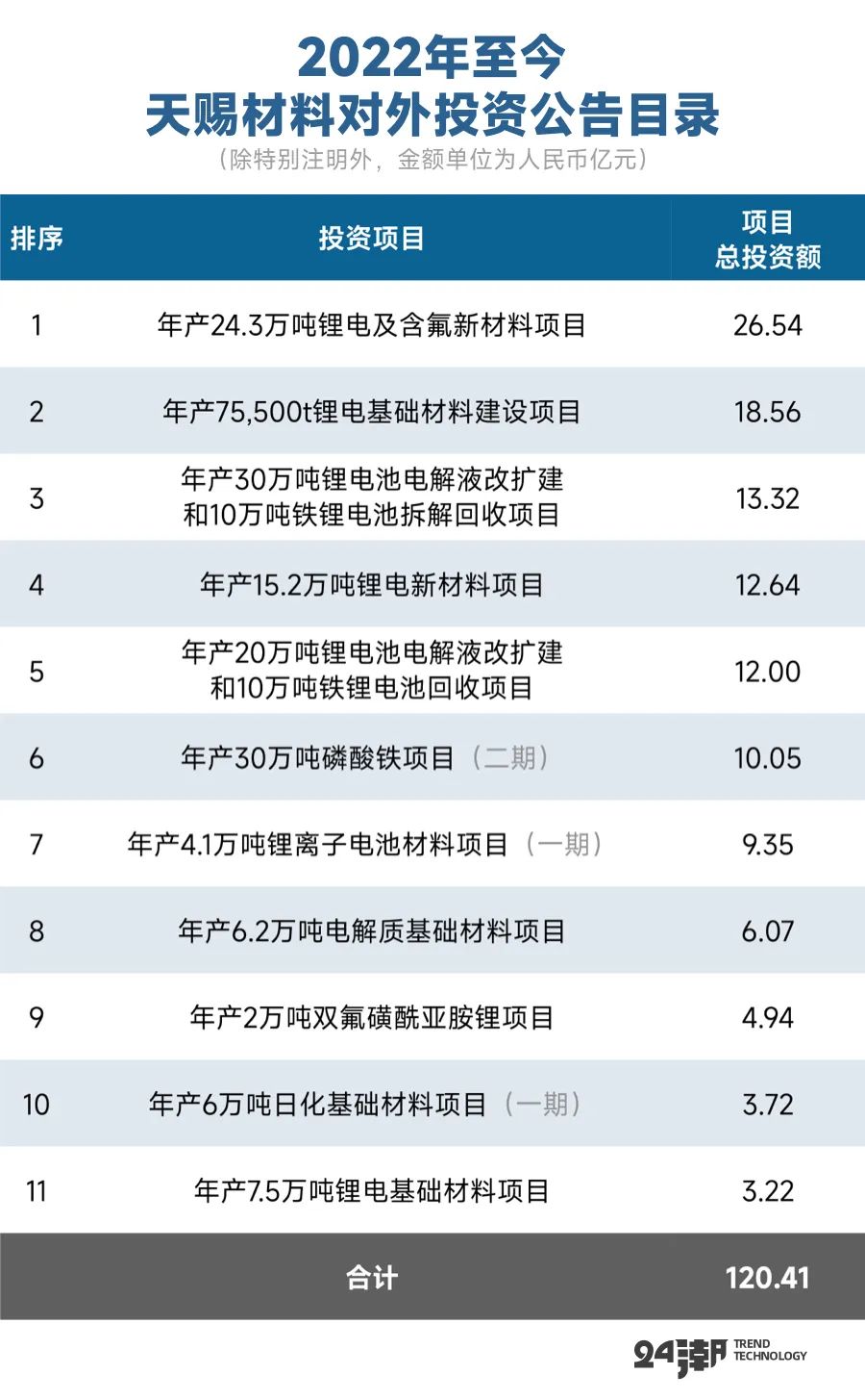 當然,從數(shù)據(jù)上看,天賜材料進擊的勢頭更猛一些。據(jù)24潮統(tǒng)計,2022年至今,天賜材料約對外公布了11個投資計劃,總投資額約為120.41億元,涵蓋電解液、磷酸鐵、電池回收、鋰電基礎材料等。