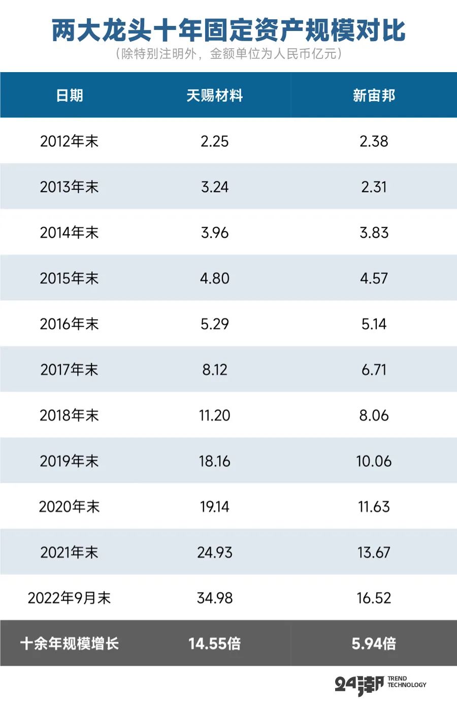 在強力投資支撐下,截止2022年9月末,天賜材料固定資產規(guī)模已增至34.98億元,較2012年末增長近14.55倍;同期新宙邦固定資產規(guī)模為16.52億元,較2012年末增長了5.94倍。