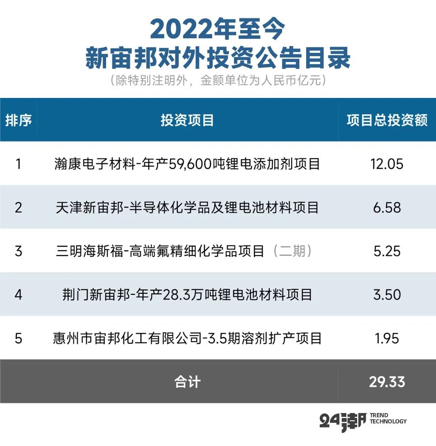 而同期新宙邦僅對外公布5個投資計劃,總投資額約為29.33億元,僅為天賜材料的24.36%。
