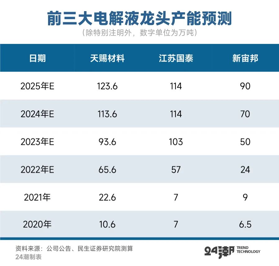 未來五年,電解液江湖可能還會有新的變化。根據(jù)民生證券分析,預計到2025年天賜材料電解液產能可能達到123.6萬噸,而新宙邦約為90萬噸,后者產能很可能被另一家老牌電解液江蘇國泰超越。