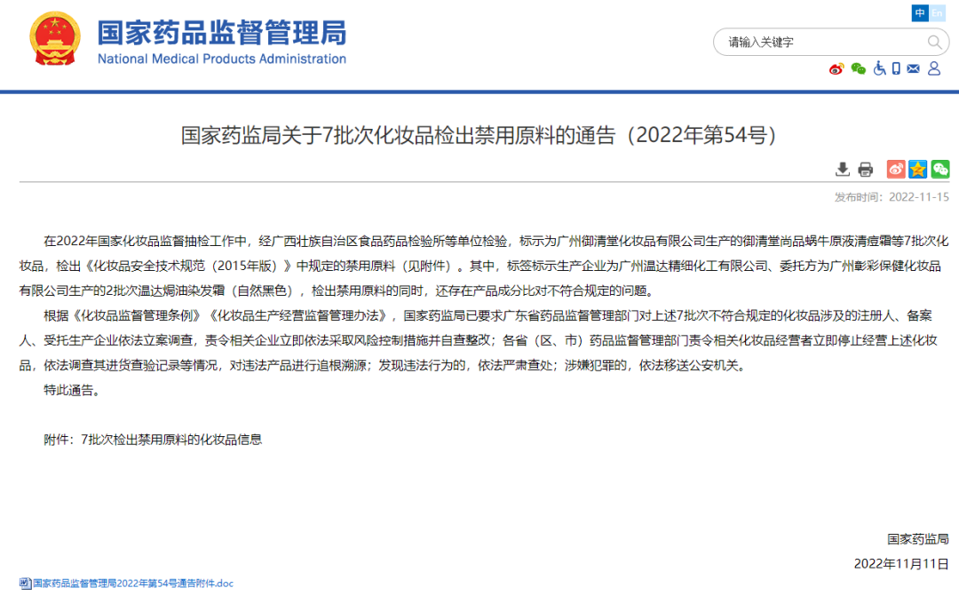 近日,國(guó)家藥監(jiān)局發(fā)布“關(guān)于7批次化妝品檢出禁用原料的通告”,公布了包括御清堂尚品蝸牛原液清痘霜等在內(nèi)的7個(gè)批次化妝品,違規(guī)添加禁用原料。