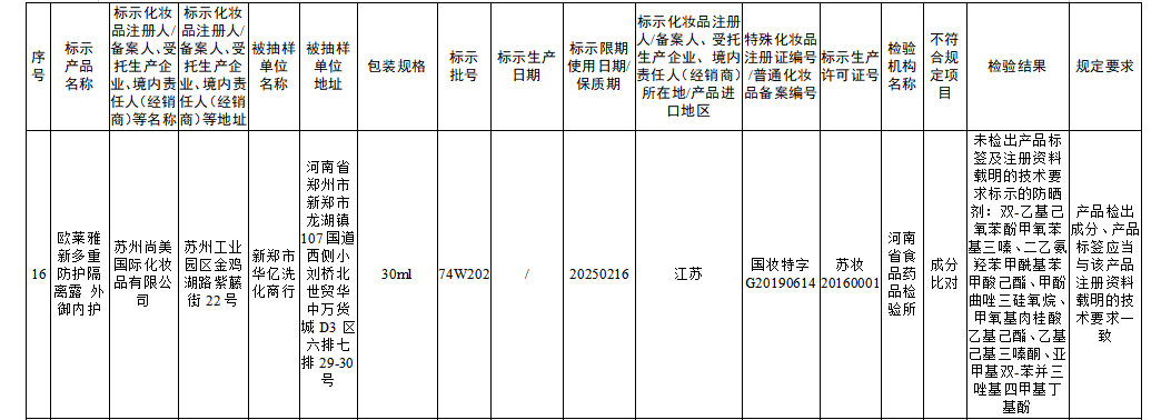 值得注意的是,在這45批次產(chǎn)品中,含1批次產(chǎn)品名稱為“歐萊雅新多重防護(hù)隔離露 外御內(nèi)護(hù)”、備案人為“蘇州尚美國際化妝品有限公司”的化妝品,因未檢出產(chǎn)品標(biāo)簽及注冊資料載明的技術(shù)要求標(biāo)示的防曬劑(雙-乙基己氧苯酚甲氧苯基三嗪、二乙氨羥苯甲?;郊姿峒乎サ攘N成分)而不合規(guī)。