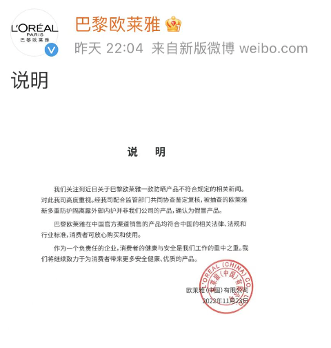 針對此事,11月23日,歐萊雅在其官方微博上回應(yīng),經(jīng)公司配合監(jiān)管部門共同協(xié)查鑒定復(fù)核,被抽查的“歐萊雅新多重防護(hù)隔離露外御內(nèi)護(hù)”并非歐萊雅公司的產(chǎn)品,確認(rèn)為假冒產(chǎn)品。