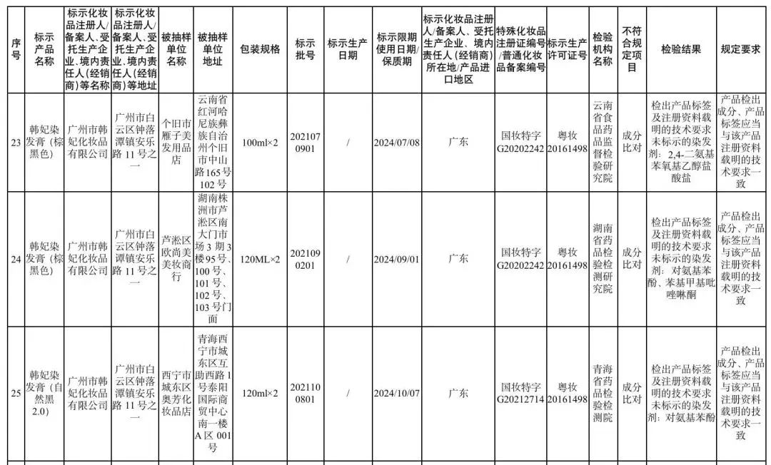 其中,由廣州市韓妃化妝品有限公司(以下簡稱廣州韓妃)生產(chǎn)備案的三款韓妃染發(fā)膏,被發(fā)現(xiàn)產(chǎn)品標(biāo)識與成分添加不一致的情況,包含對氨基苯酚、苯基甲基吡唑啉酮等三種成分。而在這之前,廣州市韓妃化妝品有限公司旗下的染發(fā)系列產(chǎn)品經(jīng)常被出不合格,2018年12次、2019年9次、2020年2次,2021年2次。