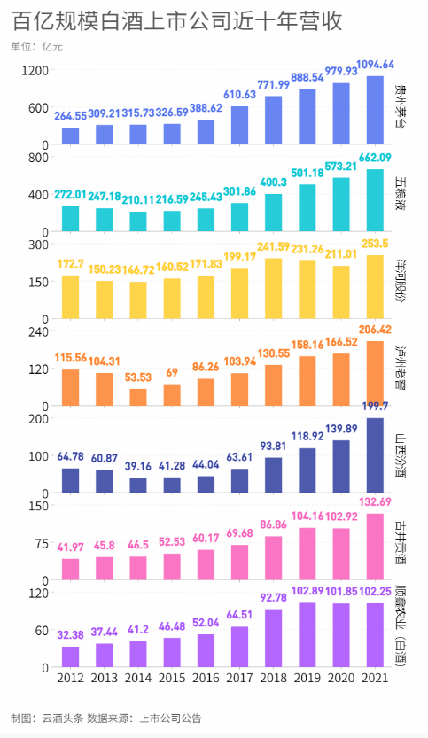 2012年時(shí),白酒行業(yè)百億酒企僅有貴州茅臺(tái)、五糧液、洋河、瀘州老窖、郎酒五家;到2021年底,山西汾酒、習(xí)酒、古井貢酒、劍南春、順鑫農(nóng)業(yè)(牛欄山)、國臺(tái)、勁牌等7家百億企業(yè)躋身百億陣營,百億以上企業(yè)共12家,其中非上市白酒公司5家。12家百億企業(yè)總營收超過3000億元,“百億陣營”營收規(guī)模較十年前翻了三倍以上。
