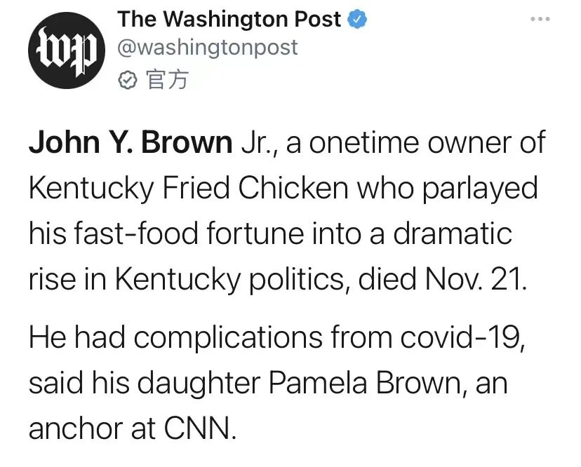 據(jù)《華盛頓郵報》報道,約翰·布朗于11月21日去世,享年88歲。在肯德基七十年的發(fā)展歷程中,有兩位重要的領(lǐng)路人:一位是肯德基創(chuàng)始人哈蘭·桑德斯,也就是花白胡子的肯德基老爺爺,已經(jīng)于上世紀八十年代去世;另一位就是帶領(lǐng)肯德基成功上市的約翰·布朗。
