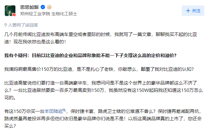 即使大家內(nèi)心愿意支持國(guó)產(chǎn)品牌,但對(duì)比亞迪的品牌形象能不能支撐一款百萬(wàn)價(jià)格的豪車,社會(huì)大眾還是心里還是打鼓的,上面知乎網(wǎng)友思思如煙的態(tài)度,就非常有代表性。