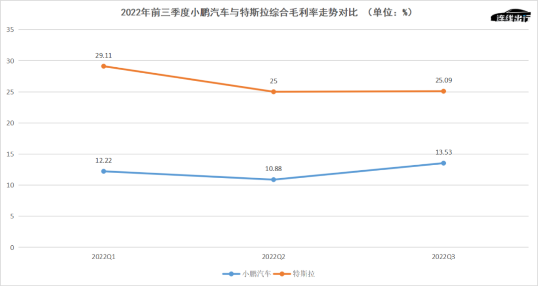 2022年前三季度小鵬汽車(chē)與特斯拉綜合毛利率走勢(shì)對(duì)比,數(shù)據(jù)來(lái)源于公開(kāi)數(shù)據(jù),連線出行制圖