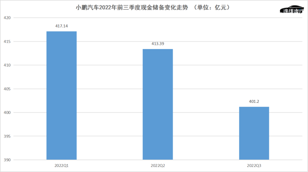 小鵬汽車(chē)2022年前三季度現(xiàn)金儲(chǔ)備變化走勢(shì),數(shù)據(jù)來(lái)源于財(cái)報(bào),連線出行制圖
