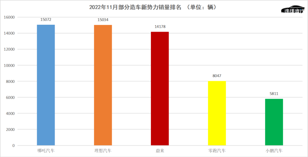 2022年11月部分造車(chē)新勢(shì)力銷(xiāo)量排名,數(shù)據(jù)來(lái)源于公開(kāi)數(shù)據(jù),連線出行制圖