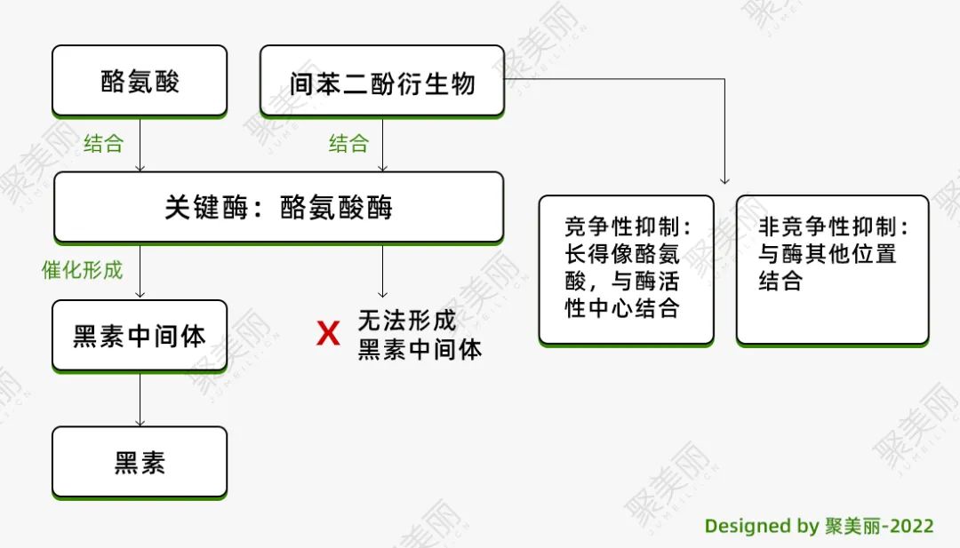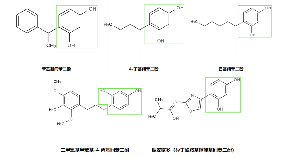 綜上,簡言之,部分間苯二酚衍生物有美白效果的原因?yàn)椋涸擃惙肿涌梢酝ㄟ^不同方式抑制酪氨酸酶的活性或減少酪氨酸酶的產(chǎn)生,阻止酪氨酸酶將酪氨酸催化成黑素合成的中間體,從而減少黑素的合成,起到美白作用。