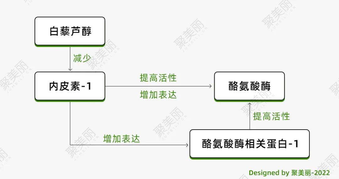 有科學(xué)家研究發(fā)現(xiàn):白藜蘆醇是一種非肽類內(nèi)皮素拮抗劑(白藜蘆醇和內(nèi)皮素的關(guān)系表現(xiàn)為此消彼長),而內(nèi)皮素-1可以提高黑素細(xì)胞的酪氨酸酶(TYR)活性以及增加酪氨酸酶(TYR)和酪氨酸酶相關(guān)蛋白-1(TRP-1)的表達(dá)。這種觀點(diǎn)認(rèn)為,白藜蘆醇是“間接”對(duì)酪氨酸酶起抑制作用的。