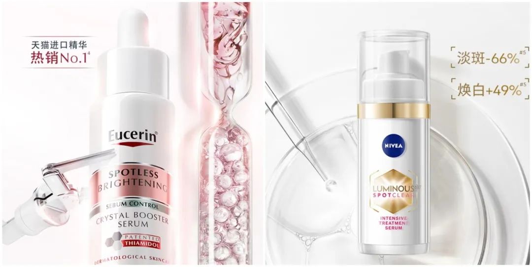 △圖:優(yōu)色林光引美白精華(左)、妮維雅630淡斑煥白精華(右),圖源天貓旗艦店
