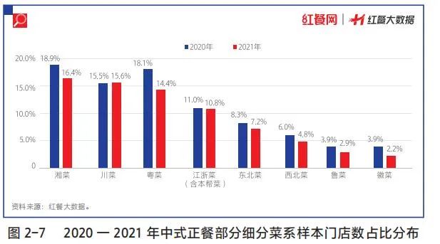 紅餐大數(shù)據(jù)顯示,江浙菜是中式正餐中除川、湘、粵菜之外門店數(shù)最多的一個細(xì)分菜系,占中式正餐總門店數(shù)的10.8%。從全國范圍來看,江浙菜在其發(fā)源地江浙滬地區(qū)的門店數(shù)占品類總門店數(shù)約三成,有七成左右的江浙菜門店分布在江浙滬以外的地區(qū)。